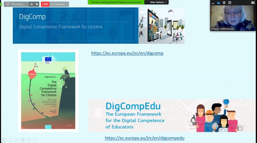 Відкрила роботу пленарного засідання Олена Чайковська, кандидат педагогічних наук, доцент, завідувач кафедри комп’ютерних наук ФІПіКБ Київського національного університету культури і мистецтв. У доповіді «Національна рамка цифрових компетентностей для вчителів» Олена Антонівна ознайомила присутніх із завданнями роботи проєкту програми Еразмус+ dComFra «Рамкова структура цифрових компетентностей для українських вчителів та інших громадян», що реалізується міжнародним консорціумом із закордонних та українських університетів, та представила напрацювання команди фахівців проєкту, які вже подані на розгляд до Міністерства освіти і науки України.