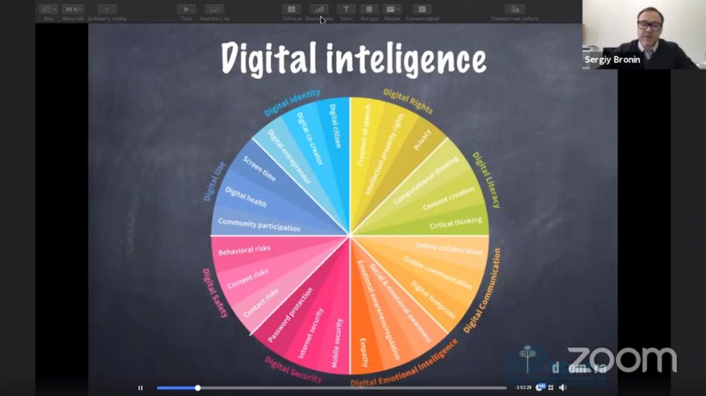 Логічним продовженням стала доповідь «Information technologies in professional and social life» від Сергія Броніна, національного координатора проєкту Еразмус+ dComFra, кандидата технічних наук, доцента кафедри інформаційних систем та технологій Київського національного університету імені Тараса Шевченка. Спікер зосередив увагу учасників на складових цифрового інтелекту і наголосив на важливості підвищення цифрової компетентності освітян та інших громадян України.