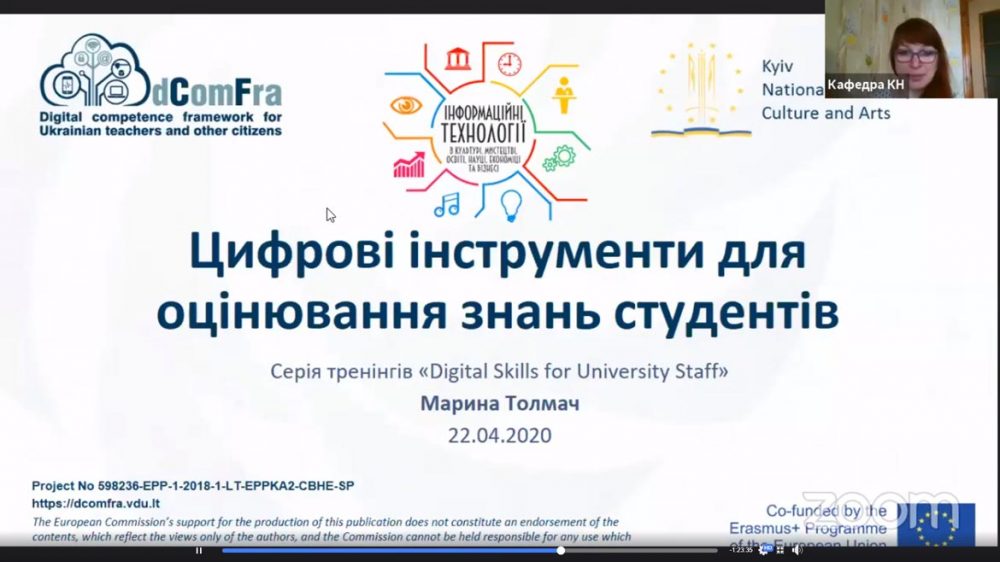 Далі за програмою конференції відбувся тренінг «Цифрові інструменти для оцінювання знань студентів» із серії «Цифрові навички для співробітників університету» (Digital skills for University Staff), що започаткована в рамках реалізації проєкту програми Еразмус+ «dComFra – Digital competence framework for Ukrainian teachers and other citizens», № 598236-EPP-1-2018-1-LT-EPPKA2-CBHE-SP.