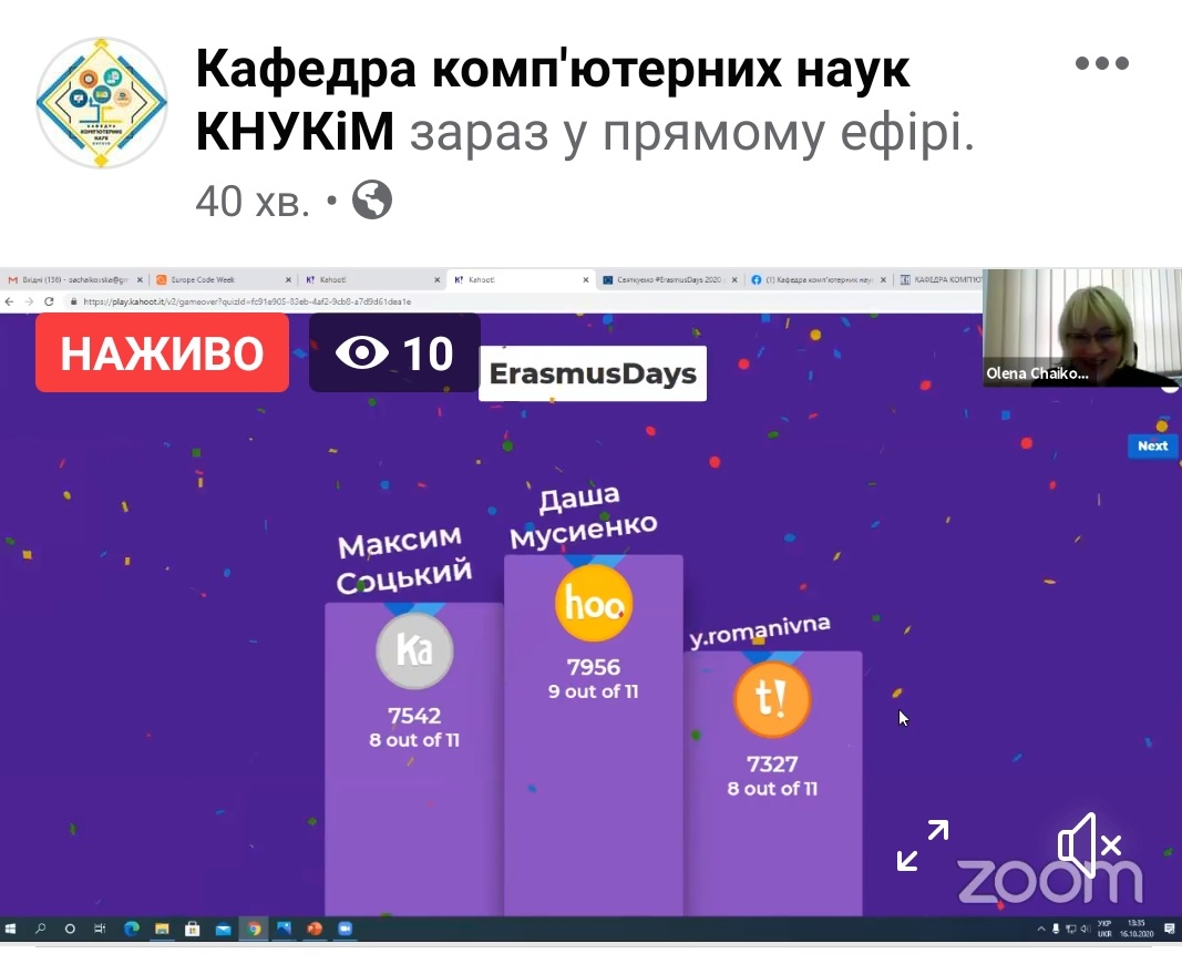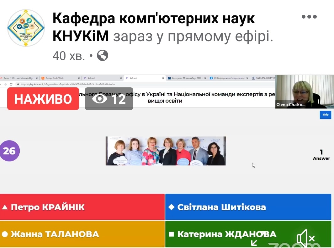 Пані Марина провела опитування учасників ErasmusDays щодо рівня цифрових навичок і захоплюючу онлайн-вікторину на тему можливостей програми Еразмус+ та цифрового сьогодення Європи й України.