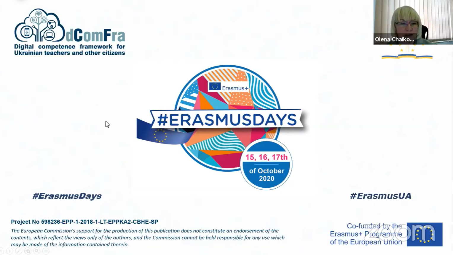 Олена Чайковська, декан факультету дистанційного навчання Університету культури, голова правління STEM-Коаліції, віце-президентка Української асоціації фахівців з інформаційних технологій, менеджерка проєкту Еразмус+ dComFra у КНУКіМ, привітала всіх присутніх та розповіла про реалізацію проєкту міжнародної програми Еразмус+ №598236-EPP-1-2018-1-LT-EPPKA2-CBHE-SP «Рамкова структура цифрових компетентностей для українських вчителів та інших громадян» (dComFra).