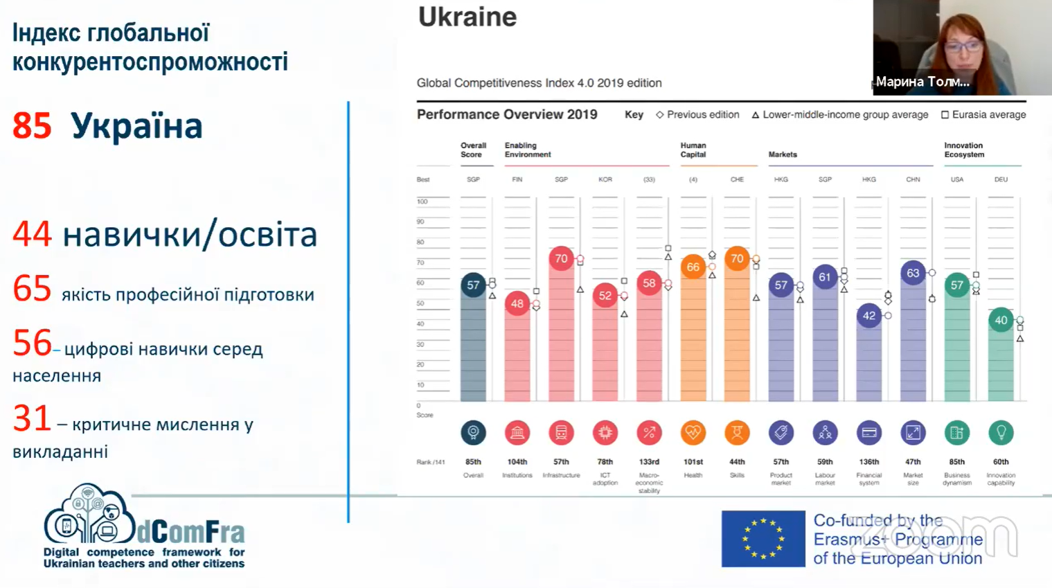 Марина Толмач, заступник декана факультету дистанційного навчання КНУКіМ, викладачка кафедри комп’ютерних наук, наголосила, що цілями проєкту dComFra – є підвищення рівня цифрових компетентностей суспільства, поширення кращих практик з реформування професійного навчання вчителів, а також використання цифрових знань і вмінь у повсякденному житті та фаховій діяльності громадян.