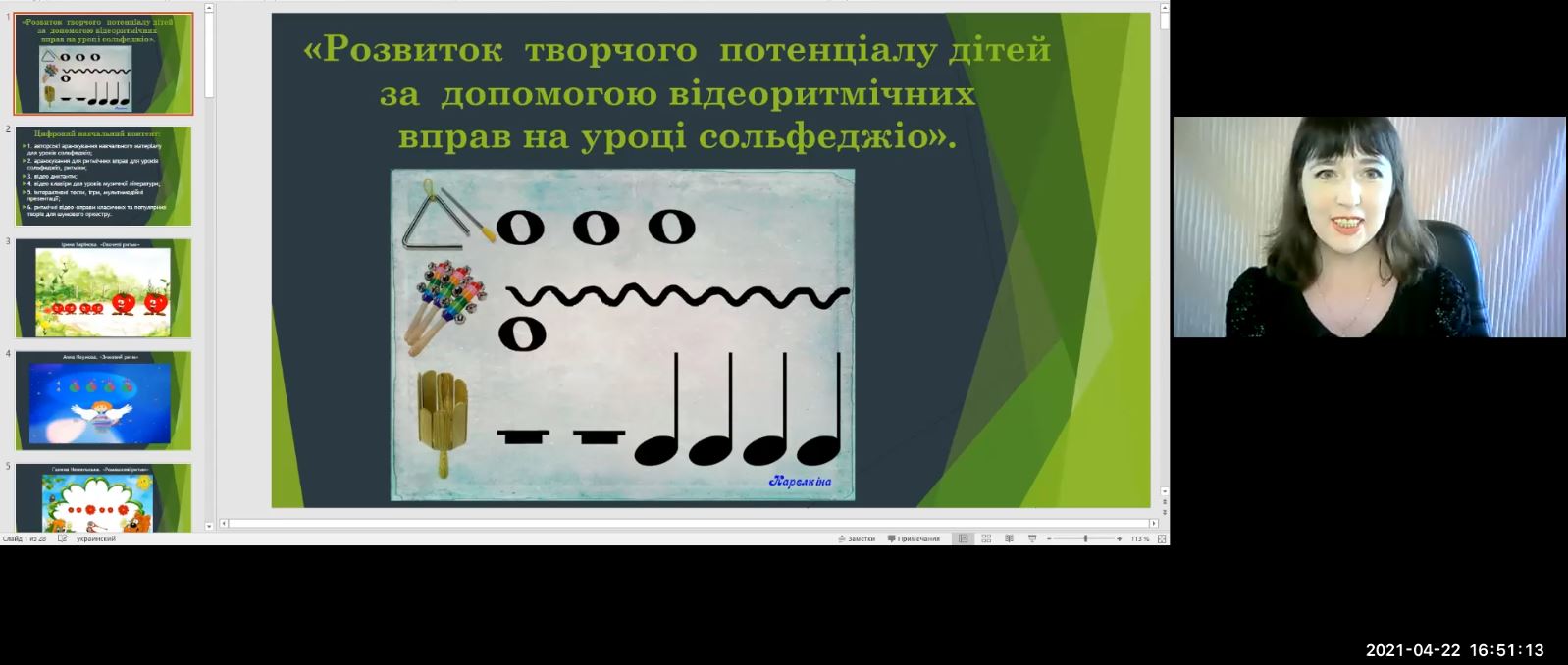 - «Розвиток творчого потенціалу дітей за допомогою відеоритмічних вправ на уроці сольфеджіо» – Ольга Карєлкіна, Куп’янська дитяча музична школа №1, м. Куп’янськ.