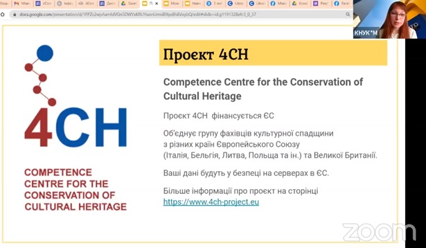 Марина Толмач, заступник декана факультету дистанційного навчання, викладач кафедри комп’ютерних наук КНУКіМ наголосила, що кафедра комп’ютерних наук тривалий час працює над темою цифровізації культурної спадщини, долучається до різних ініціатив, співпрацює з фахівцями в цій галузі та проводить заходи, присвячені збереженню культурної спадщини України в цифровому форматі. Марина Толмач більш детально розповіла про ініціативу SaveUCHdigital, яка об’єднала декілька установ, громадських та професійних об’єднань, діяльність яких безпосередньо пов’язана з цифровими технологіями в секторі культурної спадщини. Наразі перед фахівцями стоїть задача поширення інформації, тестування наданих засобів, організація та координація взаємодії.