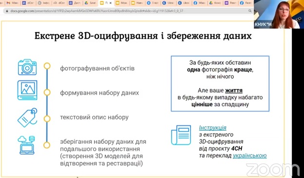 Знищення культурної спадщини країни – це найшвидший спосіб стерти її національну ідентичність. На допомогу збереження фізичних об’єктів Мариною Толмач було представлено інструкцію з екстренного 3-D оцифрування від проєкту 4СН, а також інструкцію щодо використання емблеми «Блакитний щит» для позначення культурних цінностей, які були перекладені на українську за участі студентів кафедри.