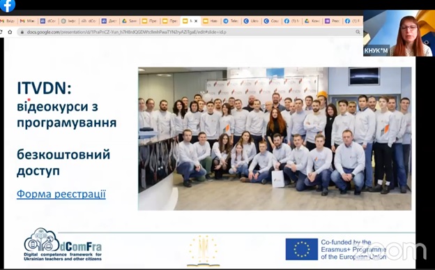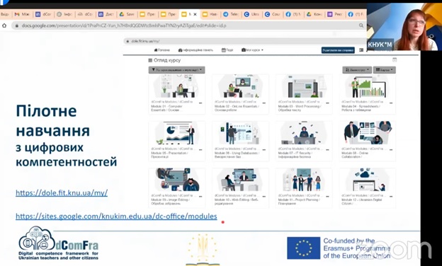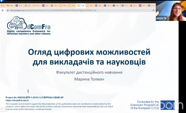 Марина Толмач анонсувала, що кафедра комп’ютерних наук продовжує пілотне навчання з цифрових компетентностей в межах проєкту dComFra «Рамкова структура цифрових компетентностей для українських вчителів та інших громадян». «Пілот розпочався у листопаді 2021 року на базі семи українських університетів-партнерів консорціуму. До навчання на базі нашого університету було залучено близько 80 учасників різних цільових категорій проєкту (вчителі шкіл, викладачі закладів мистецької освіти, ветерани АТО, внутрішньо переміщені особи, інші громадяни). Для вивчення пропонуються 22 навчальних модуля, розміщених на навчальній платформі, після завершення видається сертифікат про підвищення кваліфікації, а для найбільш успішних учасників передбачена можливість безкоштовної міжнародної сертифікації ICDL. З початком війни в Україні активність пілотного навчання суттєво зменшилась, адже університети з Харкова, Покровська, Києва опинились у зоні бойових дій. Зараз ми працюємо над відновленням діяльності проєкту, тому запрошуємо бажаючих, хто має можливість навчатись цифровим навичкам, долучатись до навчання».