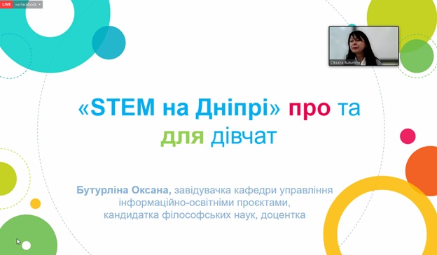 Оксана Бутурліна, PhD, керівниця проєкту «STEM на Дніпрі», завідувач кафедри управління інформаційно-освітніми проєктами Дніпровської академії неперервної освіти, ознайомила учасників з проєктом «STEM на Дніпрі», який сприяє впровадженню STEM-освіти в навчальну діяльність. «Проєкт «STEM на Дніпрі» спрямований на популяризацію STEM–професій серед дівчат й поширення актуальної інформації щодо можливостей кар’єри в технологічних компаніях». Також пані Оксана підкреслила важливість створення спільнот для дівчат, щоб долучати талановитих представниць прекрасної статі до навчання і роботи у сфері STEM, та поінформувала присутніх про освітньо-тренувальну програму «Techno-Girls. Дівчата рулять».