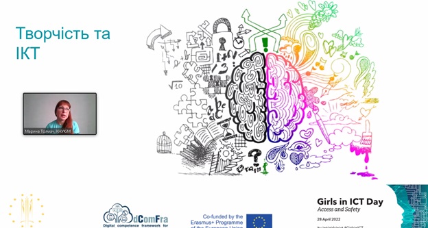 Нині для творчих дівчат є різні можливості реалізації в галузі ІКТ, тож спікерка навела приклади сучасних професій, де можна поєднати творчість, креативність і цифрові технології. Завершуючи промову, Марина Толмач побажала всім перемоги та мирного неба.