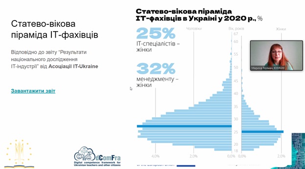 Марина Толмач, викладач кафедри комп’ютерних наук Київського національного університету культури і мистецтв, розкрила тему «Дівчата та ІТ-творчість», нагадавши про традиції святкування в університеті. Фахівчиня навела дані гендерного профіля України, складеного ПРООН, та статистику випускників STEM-спеціальностей в Україні із результатів дослідження ІТ-галузі від Асоціації IT-Ukraine.