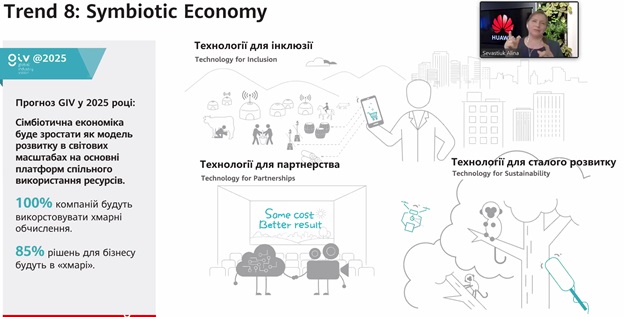 Аліна Севастюк, менеджер із зв’язків з громадськістю «Хуавей Україна» виступила з доповіддю «Навички для майбутнього: ІКТ для інклюзії та рівних можливостей». Вона ознайомила присутніх з результатами дослідження Huawei «Інтелектуальний світ 2030» та з трендами у сфері технологій, які можуть спонукати до нових спільних проєктів і партнерств. Крім того, наголосила, що саме варто врахувати у розвитку цифрових компетентностей, та запропонувала всім присутнім створити власний план дій, виявити нові можливості і цінності.